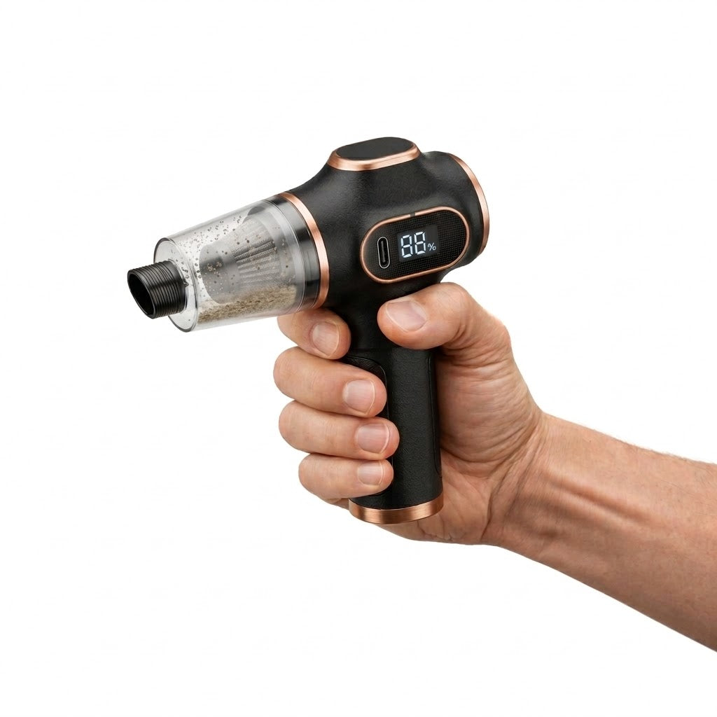 Aspirador portátil inalámbrico 2 en 1 diseñado para eliminar polvo, migas y suciedad en segundos gracias a su potente succión y función de soplado, ideal para llegar a los rincones más difíciles. Su diseño compacto, ligero y sin cables, junto con su batería recargable, accesorios intercambiables y filtro lavable, permite limpiar fácilmente coche, teclado, escritorio y cualquier espacio de forma rápida y cómoda. Potencia profesional en la palma de tu mano. Limpieza rápida y sin esfuerzo.